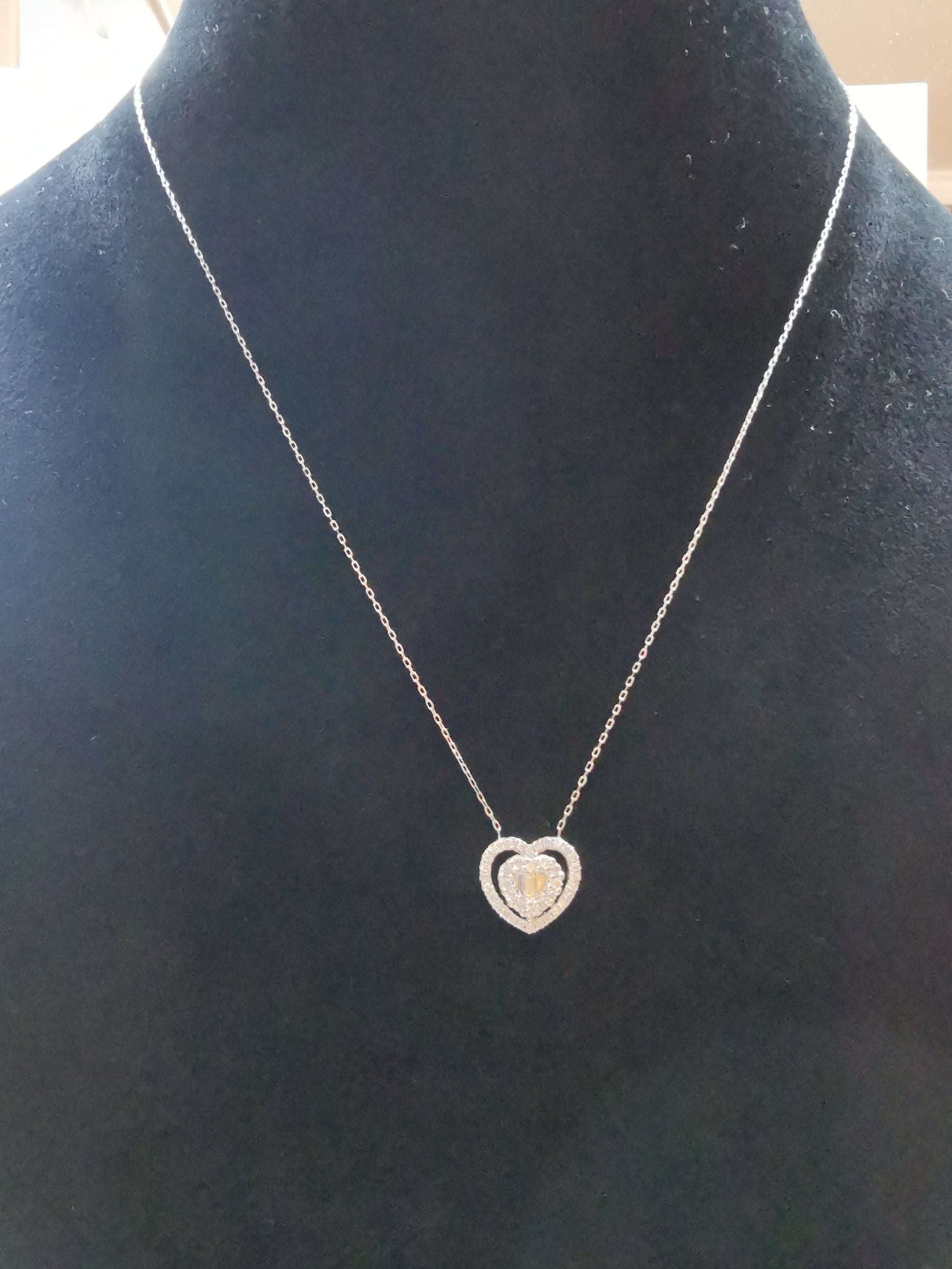 This exquisite pendant is crafted in luxurious 18K white gold, designed in a timeless open-heart silhouette. The outer heart sparkles with a halo of round brilliant diamonds, while the center features a stunning cluster of baguette and round diamonds, forming a radiant inner heart. Suspended from a delicate white gold chain, this necklace is both elegant and romantic — a perfect gift for anniversaries, special occasions, or simply to celebrate love and beauty every day.